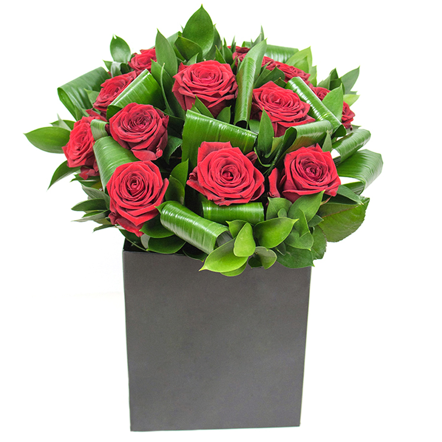Elevate any space with INFINITE BEAUTY, a luxurious red rose arrangement from Flowers Wealdstone in Wealdstone. This simple yet sophisticated design combines rich red roses with sculptural aspidistra leaves and glossy ruscus for a modern, elegant look that suits any home or special occasion.