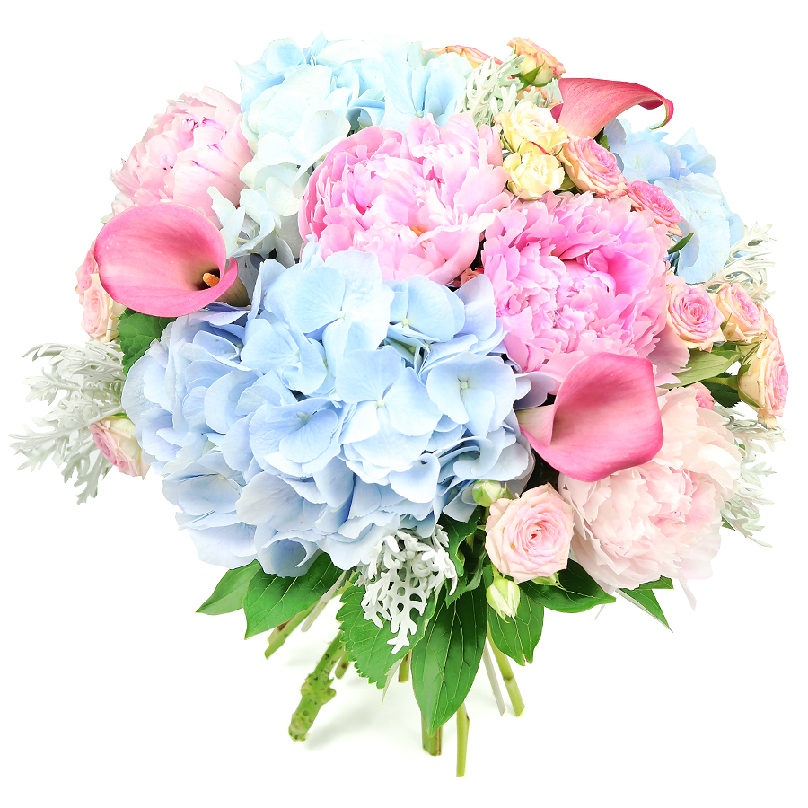 Unique and Beautiful: The Sugar Velvet bouquet is a harmonious blend of colors and flowers, including Purple Cala lilies, Blue hydrangeas, Pink peonies, and Pink sprayed roses. This stunning arrangement is perfect for adding a touch of elegance and cheer to any setting.
